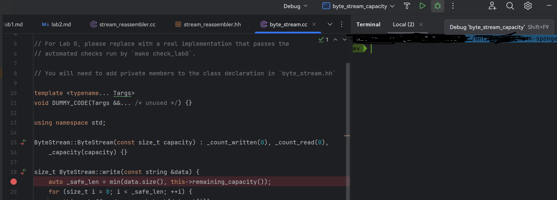 你应当具备一定的调试代码的能力。在这个 lab 中,能一次性写对这几个方法的人少之又少,因此调试就成了必不可少的一环。本文档也会介绍一下 Clion 环境下如何对这个项目进行断点调试。如果觉得断点调试有难度,也可以通过打印 log 来调试。