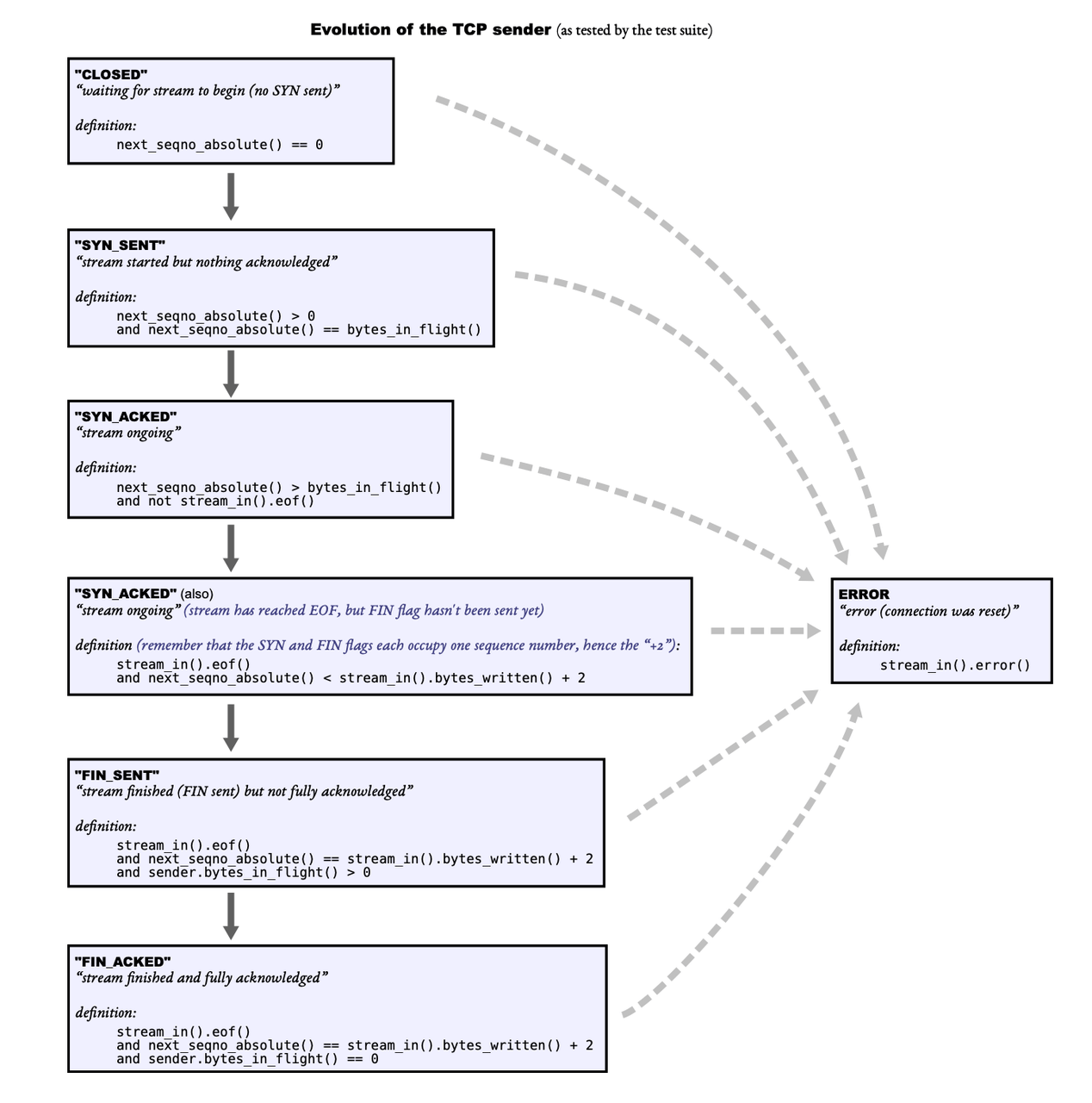 - TCPSender 的 ByteStream 叫做 stream_in,是应用程序数据进入 TCP 发送端的入口,方便 TCPSender 读取数据并封装成 TCP 段发送。