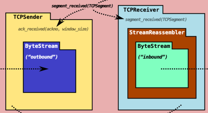 push_string()给到 TCPReceiver。这也是 lab2 的核心逻辑。 - TCPReceiver 和 TCPSender 中都包含了 ByteStream。