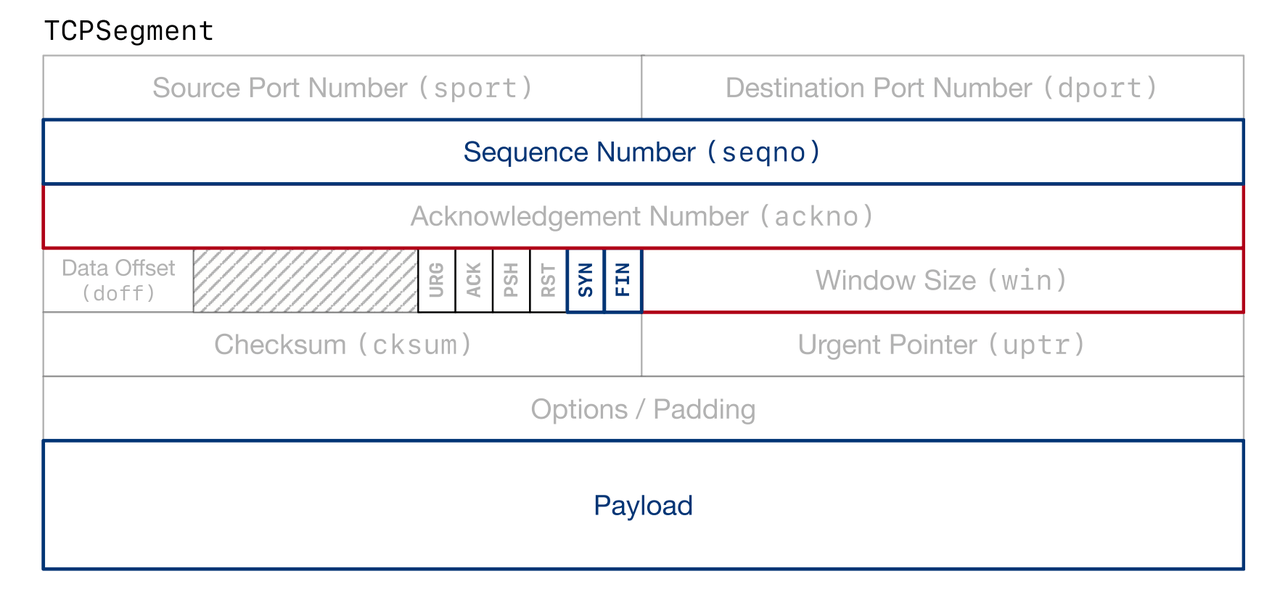 你可能会看到「三次握手」「四次握手」中 SYN 很复杂的过程概念,但在 TCPSender 中它的含义很简单:TCPSender 发出的第一个 Segment,SYN 一定为 1/true。我们也可以推断得到,TCPReceiver 接收到了 SYN(实际上第一个接受到的数据并不是 SYN,但我们在 Reassembler 中一定会把 SYN 放在第一位),也就意味着第一个段被我们接收到了。